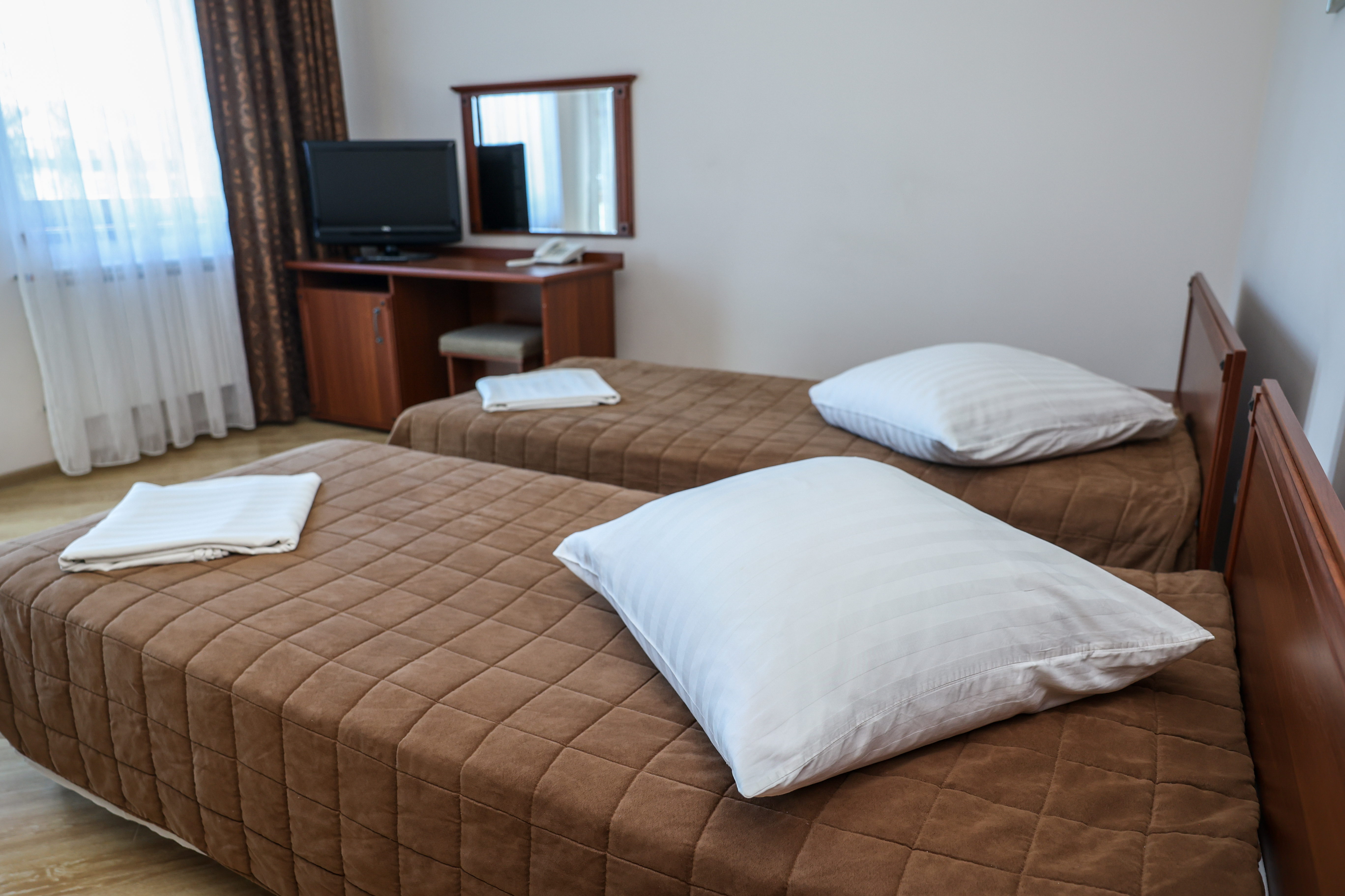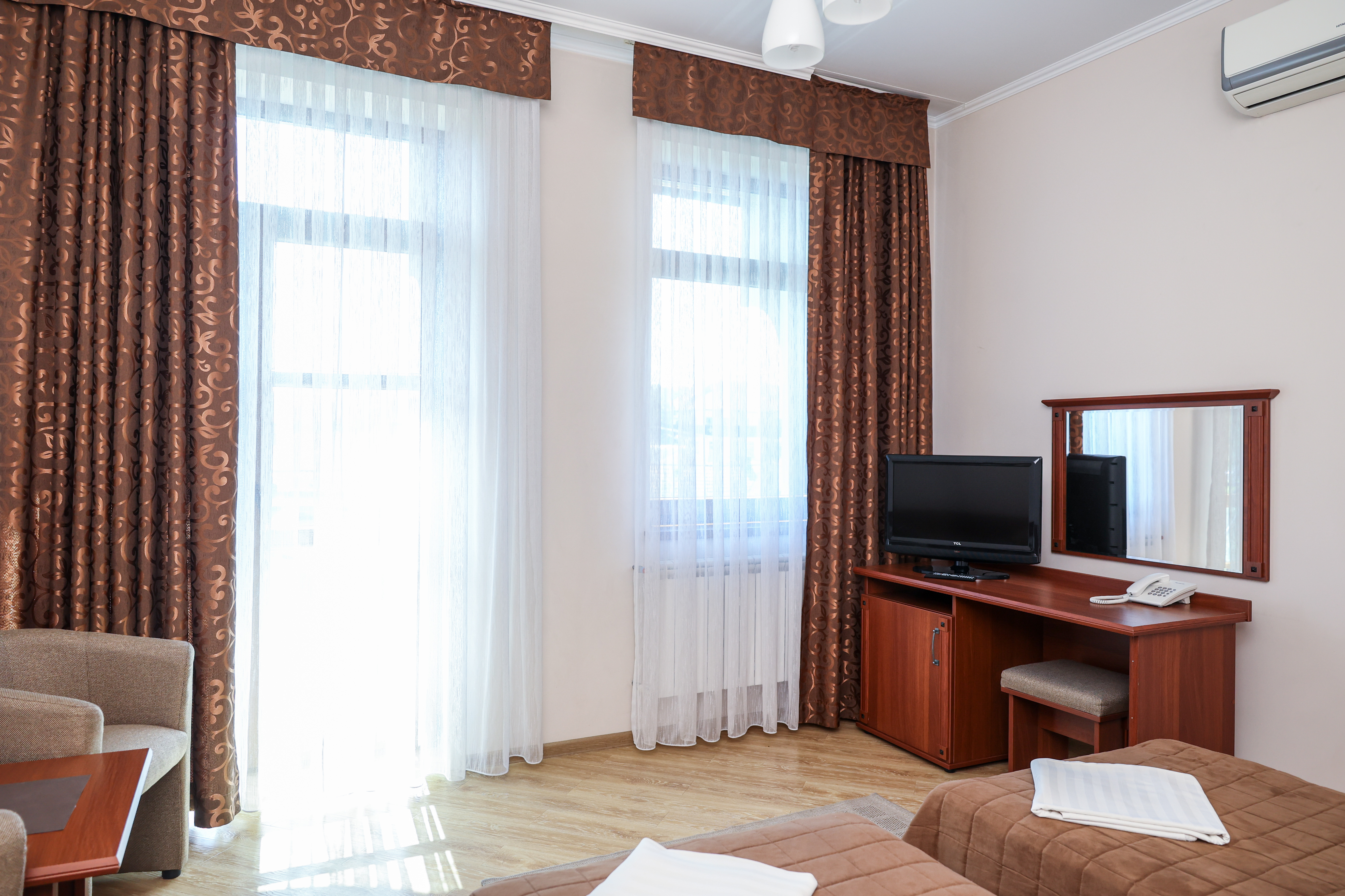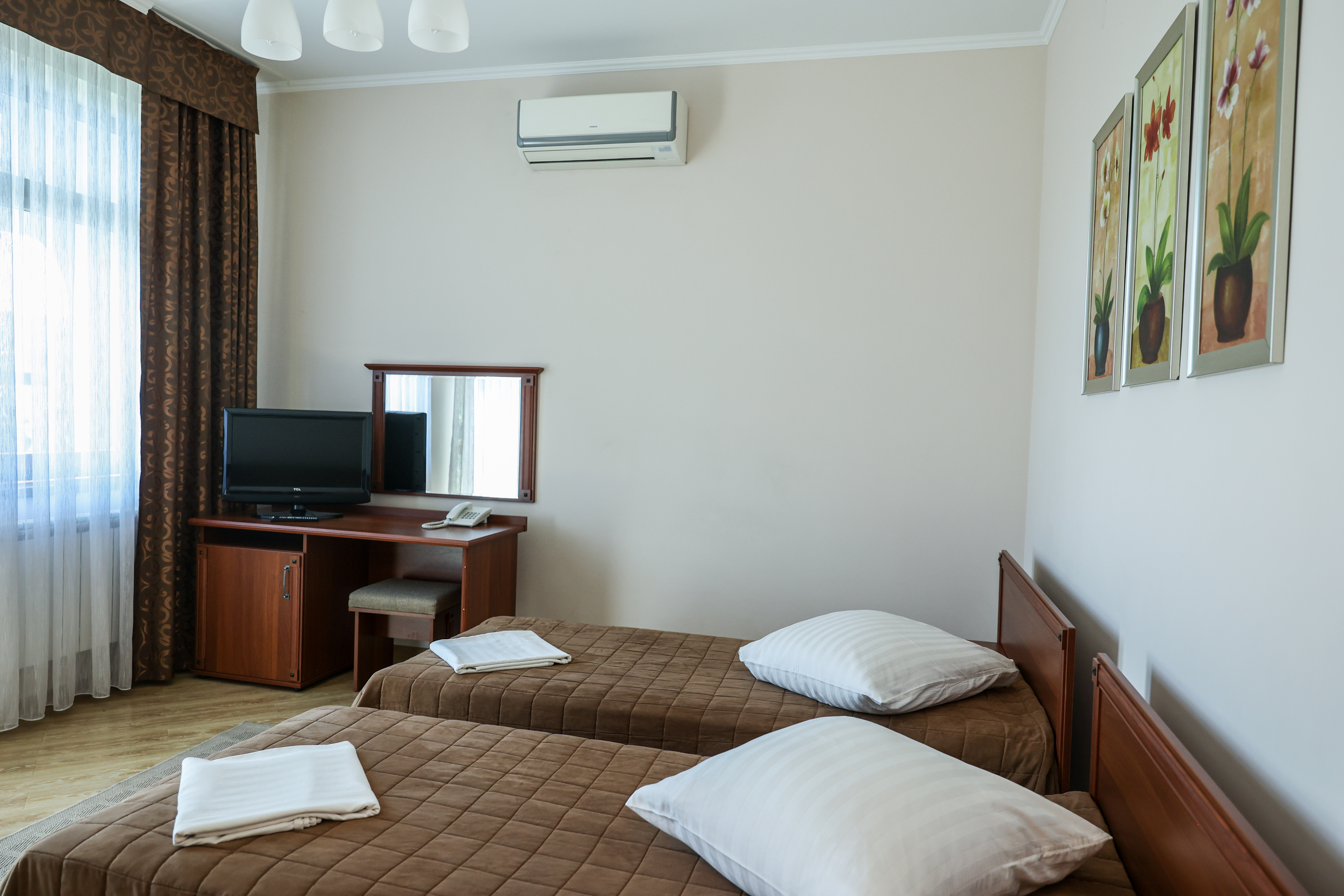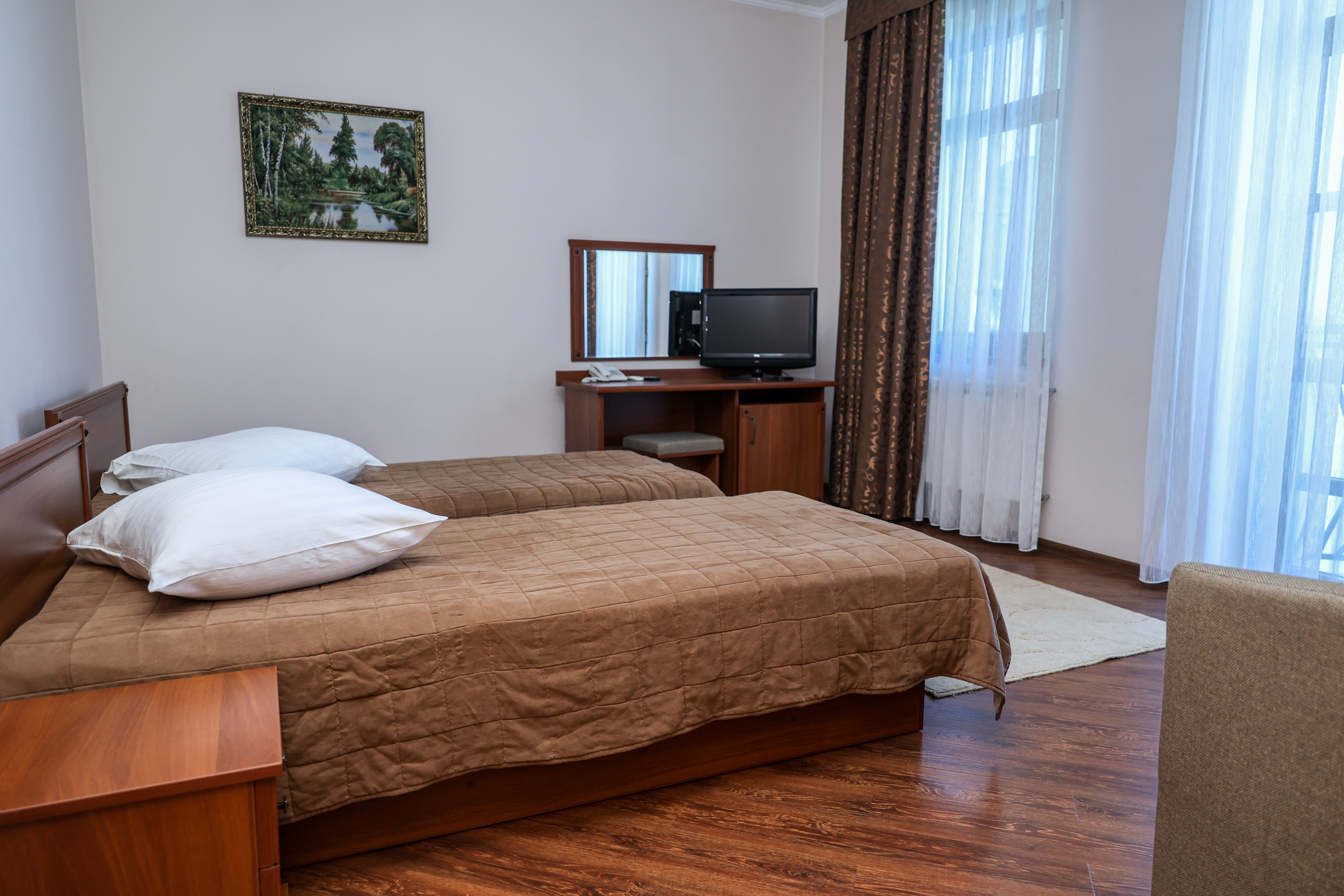Затишний номер для двох гостей із можливістю відпочинку на окремих ліжках. У більшості номерів є французький балкон.